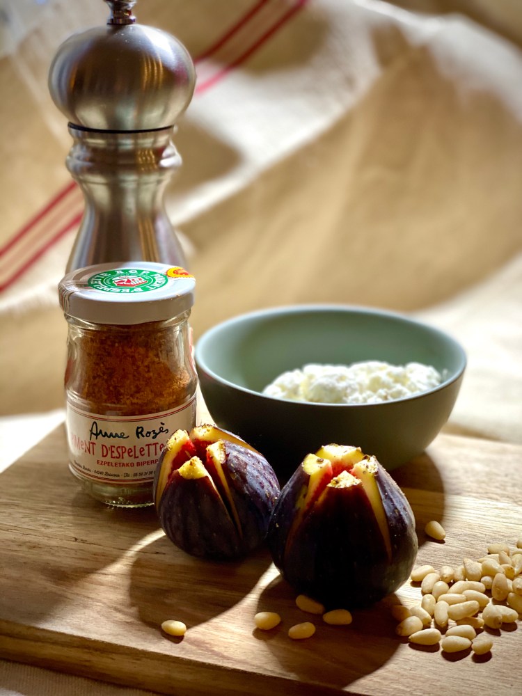 | ● 8 belles figues mures mais pas trop souples ● 1 fromage de chèvre frais (type Petit Billy) ● 1 poignée de pignon de pin ● Miel de montagne ● Poivre du moulin ● Piment d’Espelette |