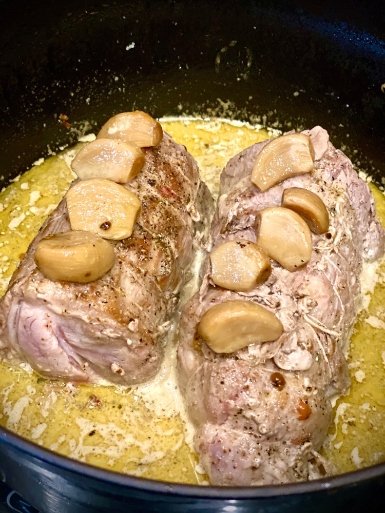 Pour les gousses d’ail, j’ai pris les gousses d’ail que j’avais confies au printemps, elles vont parfumer délicatement le rôti et la sauce de cuisson.