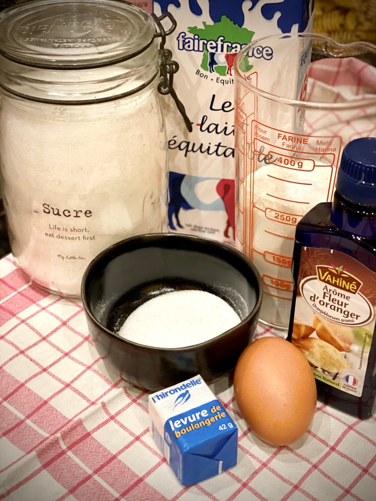 | ● 100 ml de lait ● 30 gr de sucre ● 1 cuillère à café de sel fin ● 1 œuf + 1 pour la dorure avant cuisson ● 250 gr de farine ● 3 cuillères à soupe d’eau de fleur d’oranger ● 12 gr de levure fraîche ● 35 gr de beurre ● Sucre perlé appelé aussi sucre grains |