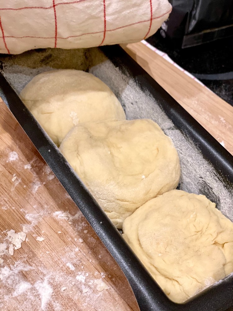 Prenez un moule pour y déposer trois boules de pâte égales. Remettre au repos pour 45 minutes recouverte, la brioche va continuer à pousser et doubler de volume.