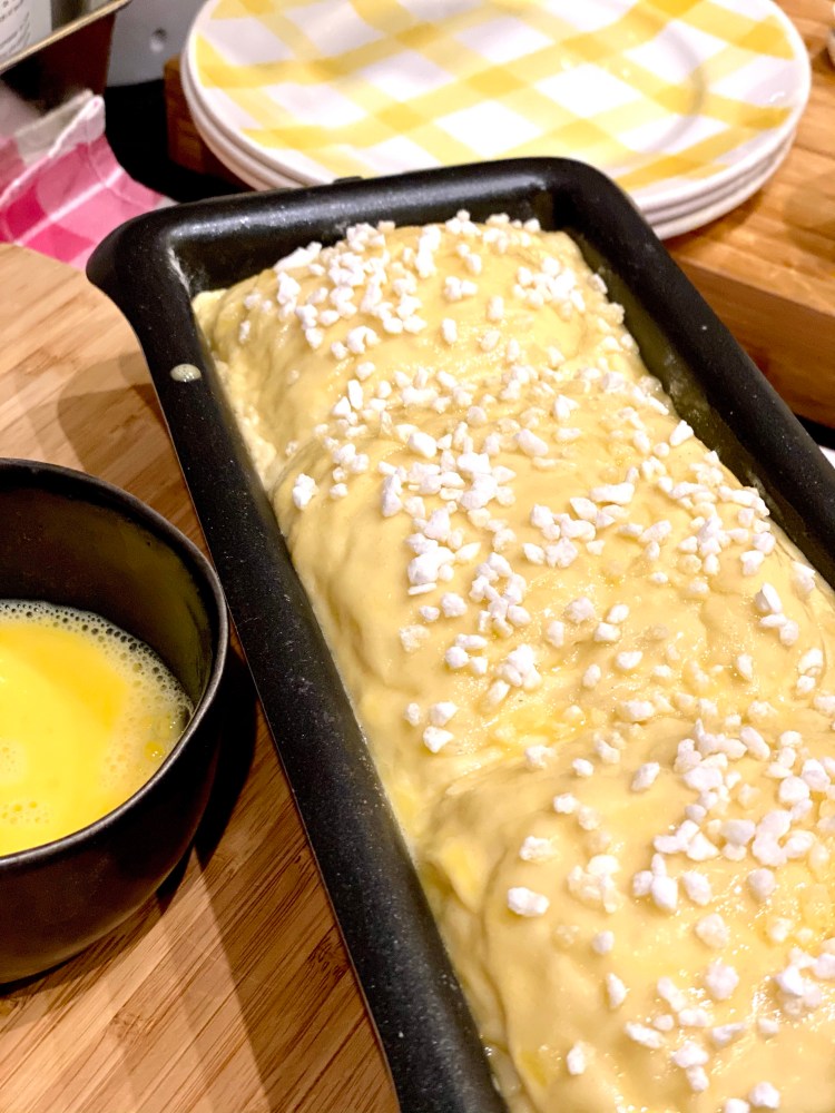 Battre un œuf pour badigeonner votre brioche et saupoudrer de sucre perlé à votre convenance.