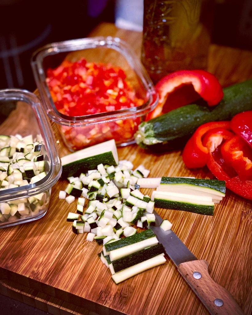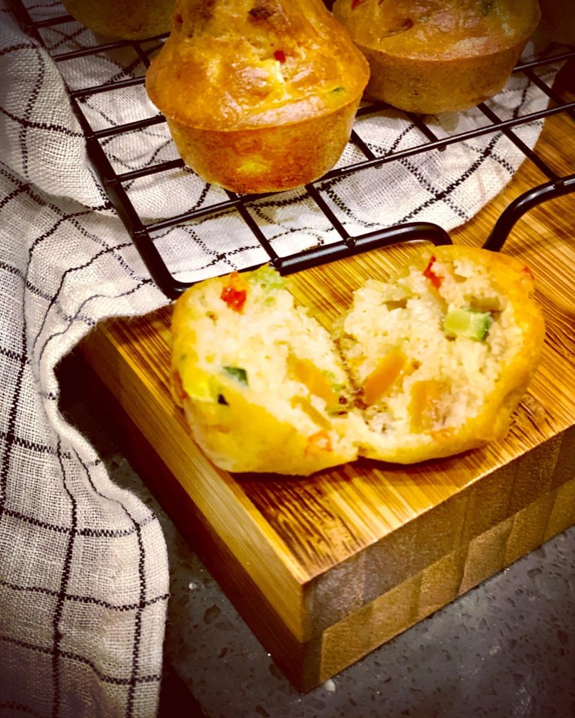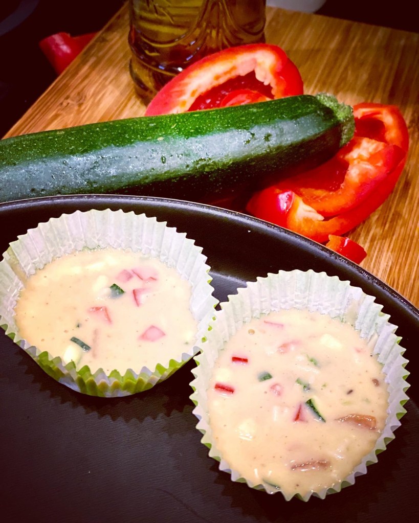 Aujourd’hui, il me restait 1 courgette et un demi poivron rouge que j’ai découpés en tous petits cubes pour les mini muffins.