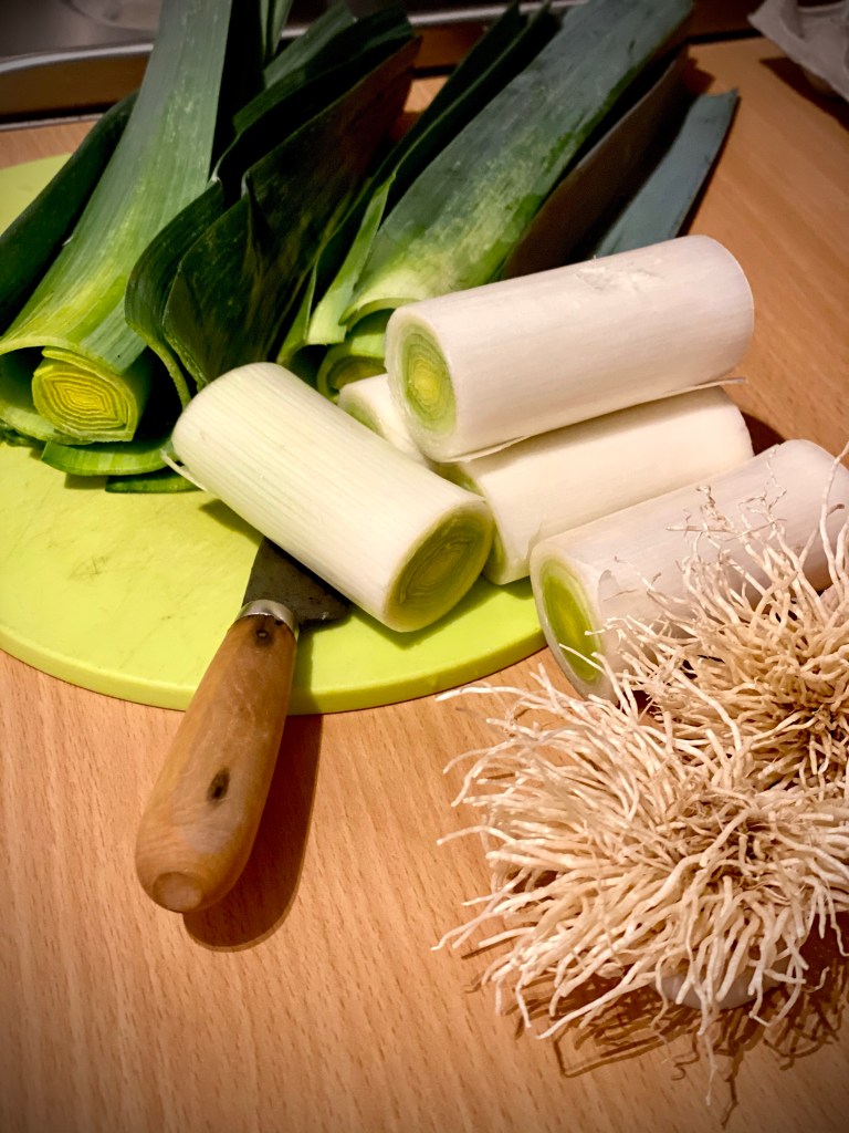 Je prépare les poireaux en les coupant en deux dans le sens de la longueur pour les nettoyer sous l’eau claire et retirer le sable avant de les émincer en fins tronçons.